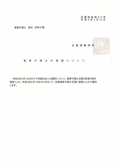 当事務所では、海事法令に関する業務もご相談可能です。資格としては、知名度が高くはないと思いますが、「海事代理士」資格を保有し、近畿運輸局に登録しています。