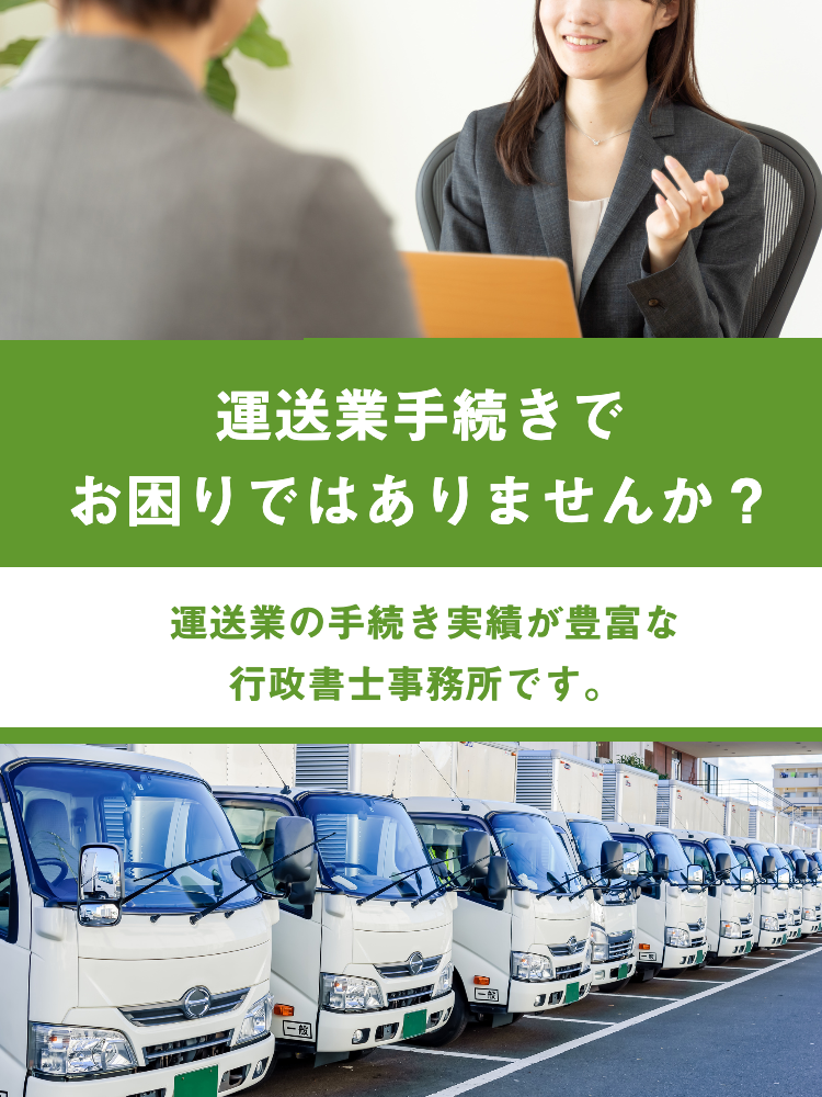 当事務所では運送業の豊富な申請実績をもとに、最適なアドバイスとスピーディーな対応を心がけています。申請・届出業務の不安を解決したい方はぜひ、ご相談・ご依頼ください。