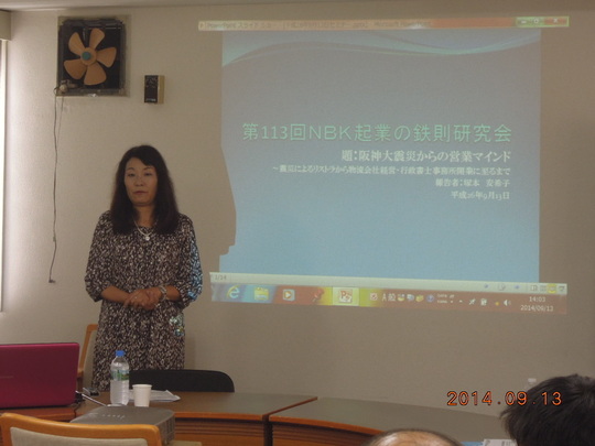 2014年9月13日(土) 阪神大震災からの営業マインドのタイトルで、震災によるリストラから物流会社経営・行政書士事務所開業に至るまで、をお話しさせていただきました。