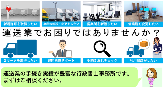 大阪での一般貨物(トラックなど)の許可申請、営業所・車庫の新設・移転の申請、Gマーク取得、巡回指導対策など、運送業に特化した行政書士がサポートいたします。