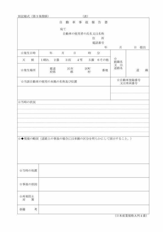事故報告書に記載する内容は事故報告の様式を見るとわかりやすいかと思います。